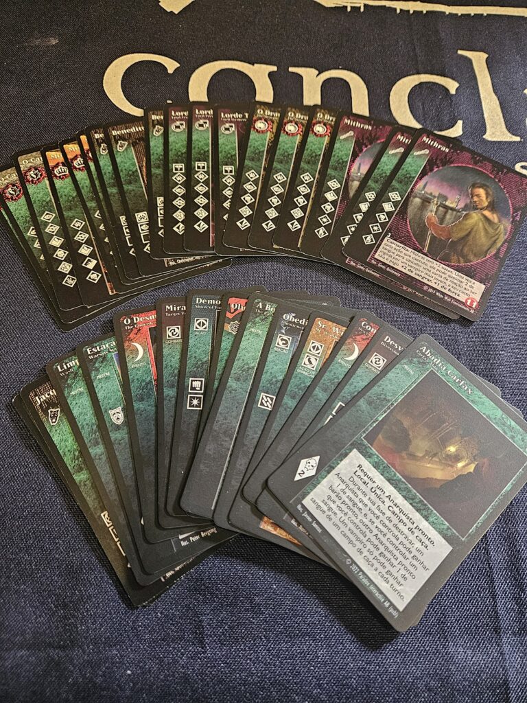 Aqui vai um esclarecimento importante: a Paradox e a BCP estabelecem regras sobre o que podemos fazer. Cartas “legacy” (tudo que não é da edição V5, incluindo as antigas e as PnP) só podem ser vendidas diretamente para vocês, jogadores, não para lojistas. É uma regra contratual que precisamos seguir.